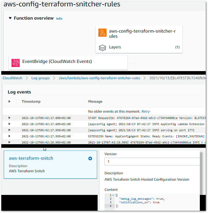 Ok, now we should be ready to test it, we should see all the AWS resources ready, such as our Lambda function having the EventBridge as the trigger, CloudWatch Logs, and our AppConfig configuration.