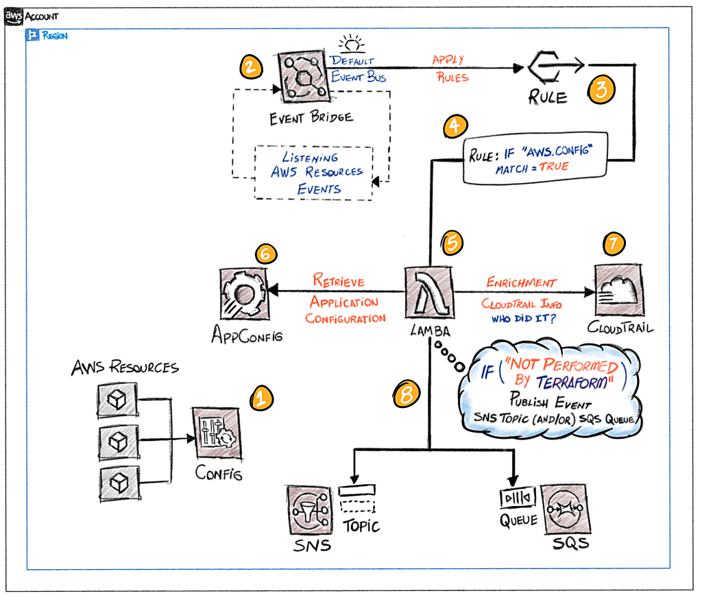 - Finally, if the Configuration Item Change launch by the AWS Config, end up being confirmed by our Lambda function as not performed by Terraform, we send a notification (we snitch) to an SNS Topic (or/and whatever else we want).