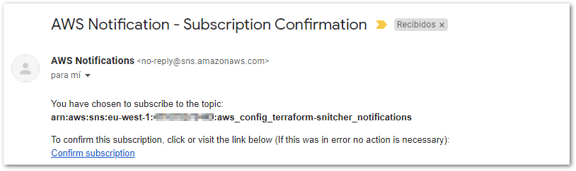 As we mentioned before, about the workspace configuration parameters, at the file workspace-config/dev.yml you can find the value for sns_notification_email. That’s the email that will receive alerts from SNS Topic regarding changes not made by Terraform. A few moments after Terraform finishes the apply command, this e-mail should receive the confirmation subscription, check and confirm the subscription.