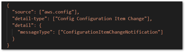 - At AWS EventBridge, we have to create a Rule in the default Event Bus, basically saying which kind of events we want to be caught and handle by this Rule. In our case, events from AWS Config Service of the type Configuration Item Change. That’s the Rule: