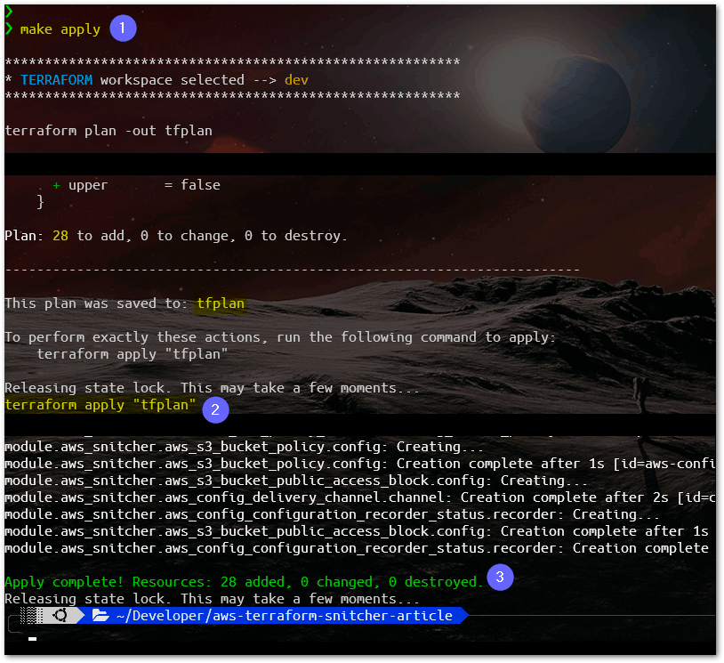 With the dev Terraform workspace selected, using make command we can execute the target called apply.This target will launch the commands terraform plan and apply, consecutively. We should end up with 28 resources added representing the architecture we’ve seen here at the architecture solution diagram.