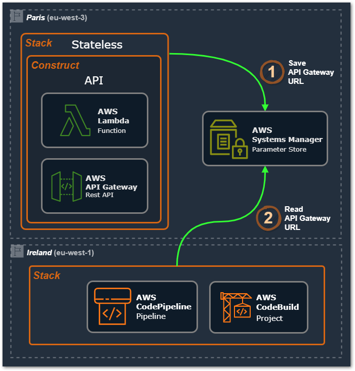 In the case of the Preprod, the Stack which has the API Gateway is located at eu-west-1 (Ireland), and the Stack which has the Pipeline is located at eu-west-3 (Paris) AWS Region. So, how can we share this information between two Stacks in different AWS Regions? For that situation, we use the service Parameter Store from AWS Systems Managers, (see next image). First (1), at the first Stack (the one with the source of the dependency) we save that information at Parameter Store in its own AWS Region, then (2), at the other Stack (the one that depends on it) we read it at the Parameter Store in the AWS Region where it is stored.