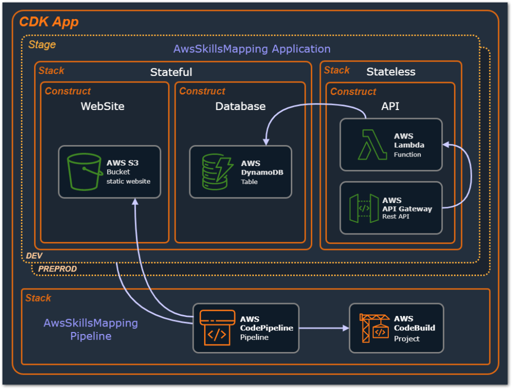 - Stage: a representation of an abstract application modeling, that will consist of Stacks that should be deployed together. We then create instances of this Stage multiple times, each by the distinct environment we need to deploy our application.