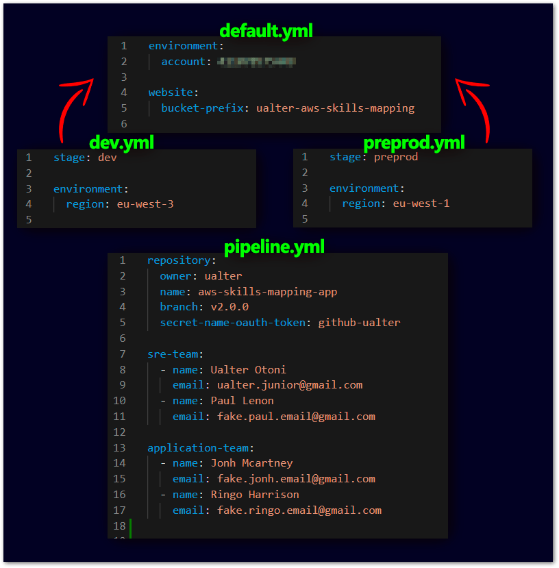 In the second section (2), we have every information configuration externalized in YAML files, split by Stages, and an extra one for the Pipeline. Here is a sample of their contents: